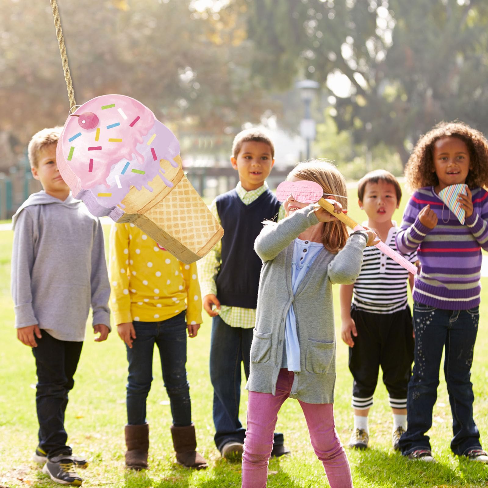 - What You Will Get: you will get 1 piece ice cream hanging Piñata, 1 piece ice cream theme pink and purple Piñata stick and 1 piece of blindfold, a nice combination of your ice cream party decoration need and convenience for use; And you can share them with your families according to knocking the ice cream Piñata to liven up your summer theme birthday party